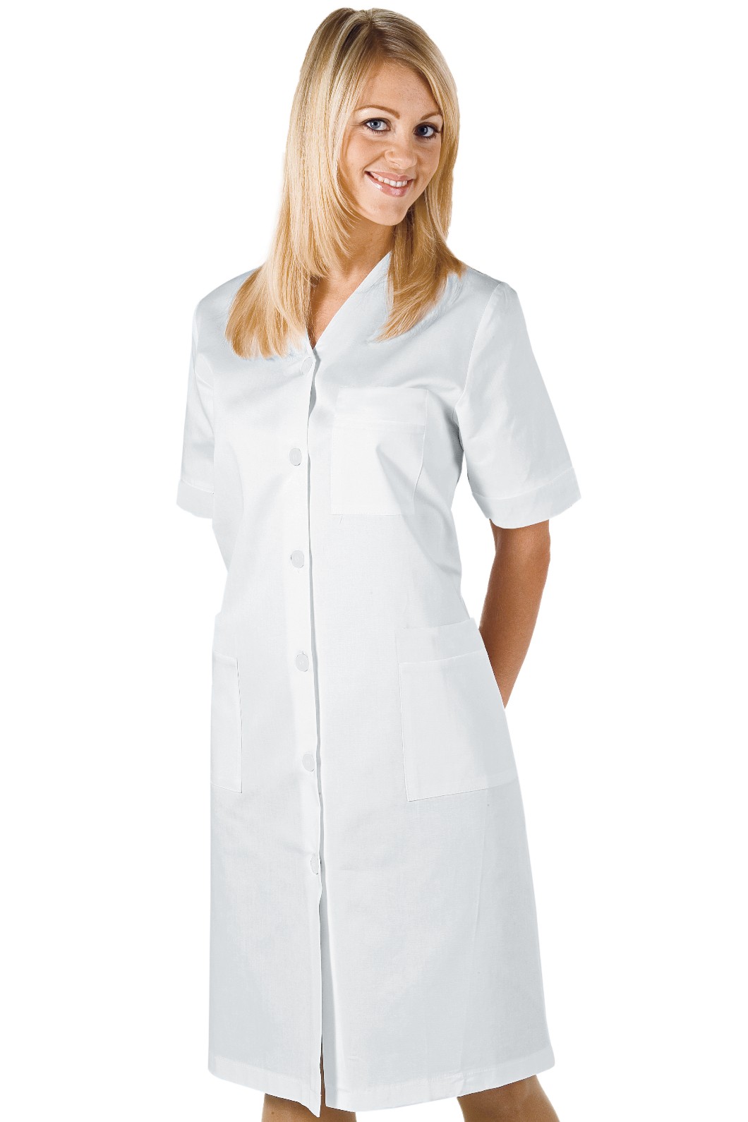 Camice Professionale da Donna Lungo a Maniche Corte in Cotone Bianco, Senza Revers per Personale di Servizio. Articolo: 007150 Michelle