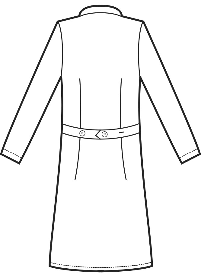 Sono presenti due ampie tasche inferiori, poste su ogni lato del camice, più un taschino, posto in alto, sul lato sinistro del petto, ed è presente anche una martingala posteriore in due pezzi, con due bottoni al centro, così da poter eventualmente stringerlo in vita.