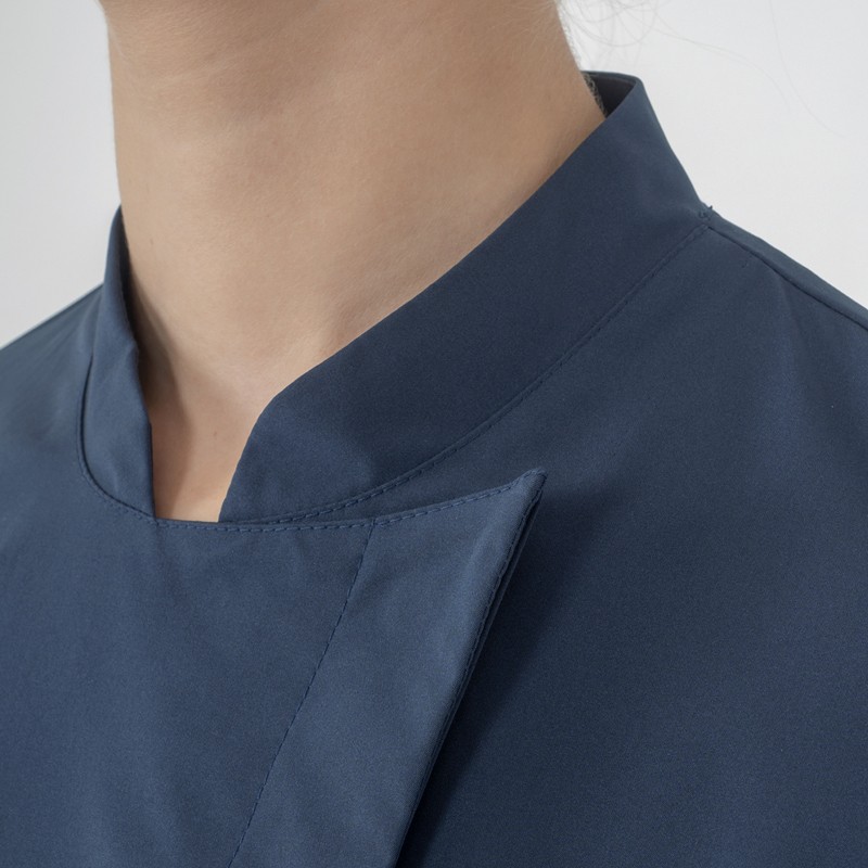 Il design raffinato prevede un collo alla coreana con linea arrotondata, abbottonatura nascosta con automatici, spacchi sul retro che esaltano la linea Slim Fit, un taschino sul petto lato cuore e un portapenne logato sulla manica.