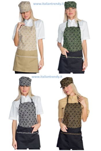 – Disponibili anche altre tipologie di grembiuli con la stessa fantasia oltre a giacche, pantaloni e cappelli da abbinare