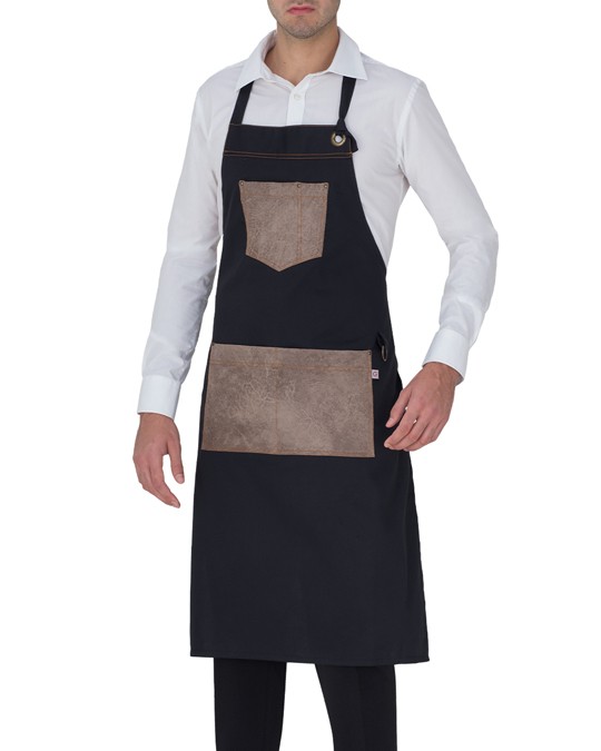 Il grembiule con pettorina Manchester è moderno e di grande impatto visivo, realizzato in due diversi tessuti di alta qualità.