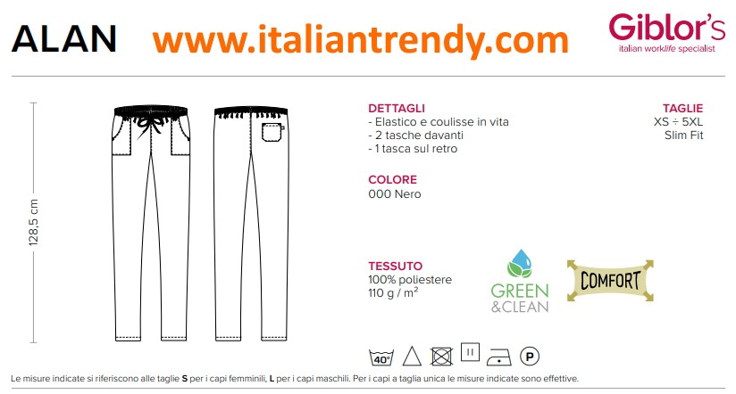 Pantaloni Neri Unisex per Cuoco, Cucina, Pizzeria, Estetica e Medicale – Comfort e Versatilità. Alan 24P08P400 Giblor’s Linea Top