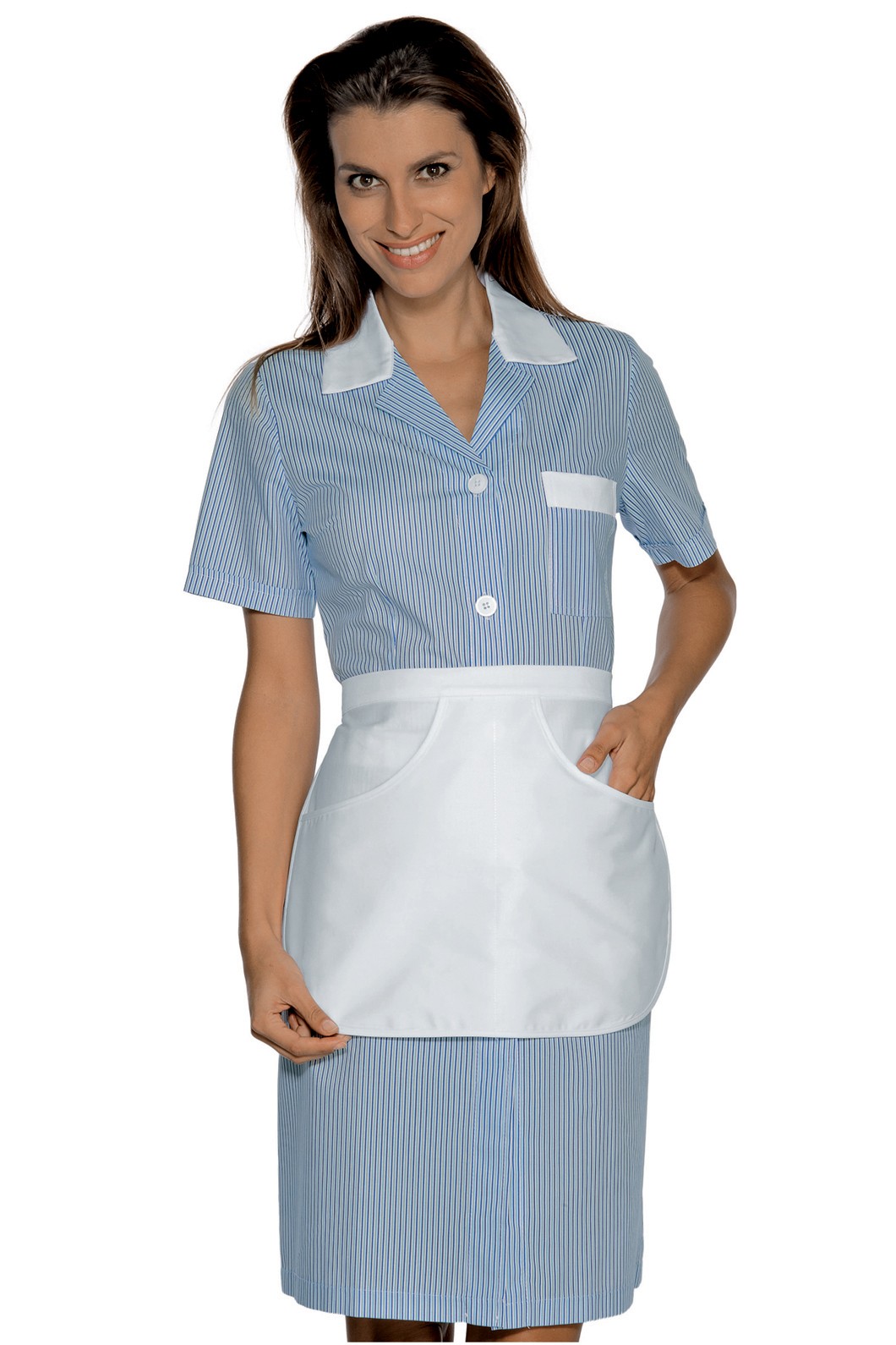 Camice da donna a manica corta compreso di grembiule per personale di servizio, settore alberghiero in tessuto leggero azzurro rigatino.