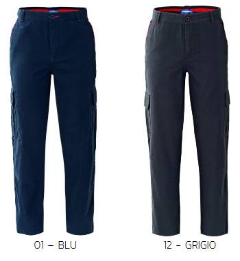 Moderni e professionali pantaloni cargo da uomo dal peso estivo grigi o blu con rifiniture in rosso con tasche laterali (new santiago).