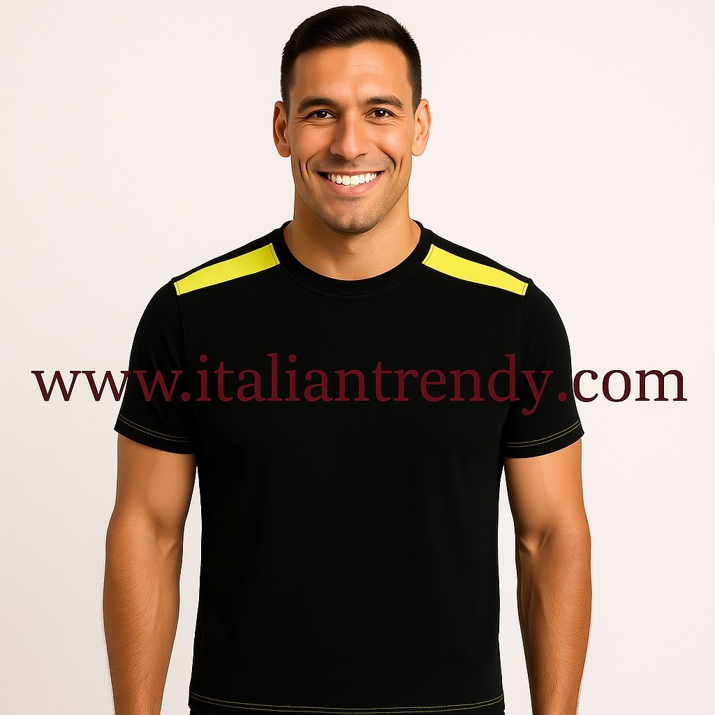 Dotata di una fascia para-sudore di colore a contrasto nella parte posteriore del collo e un girocollo in maglina con doppio tessuto e parte interna di colore a contrasto, questa maglietta garantisce freschezza e resistenza.